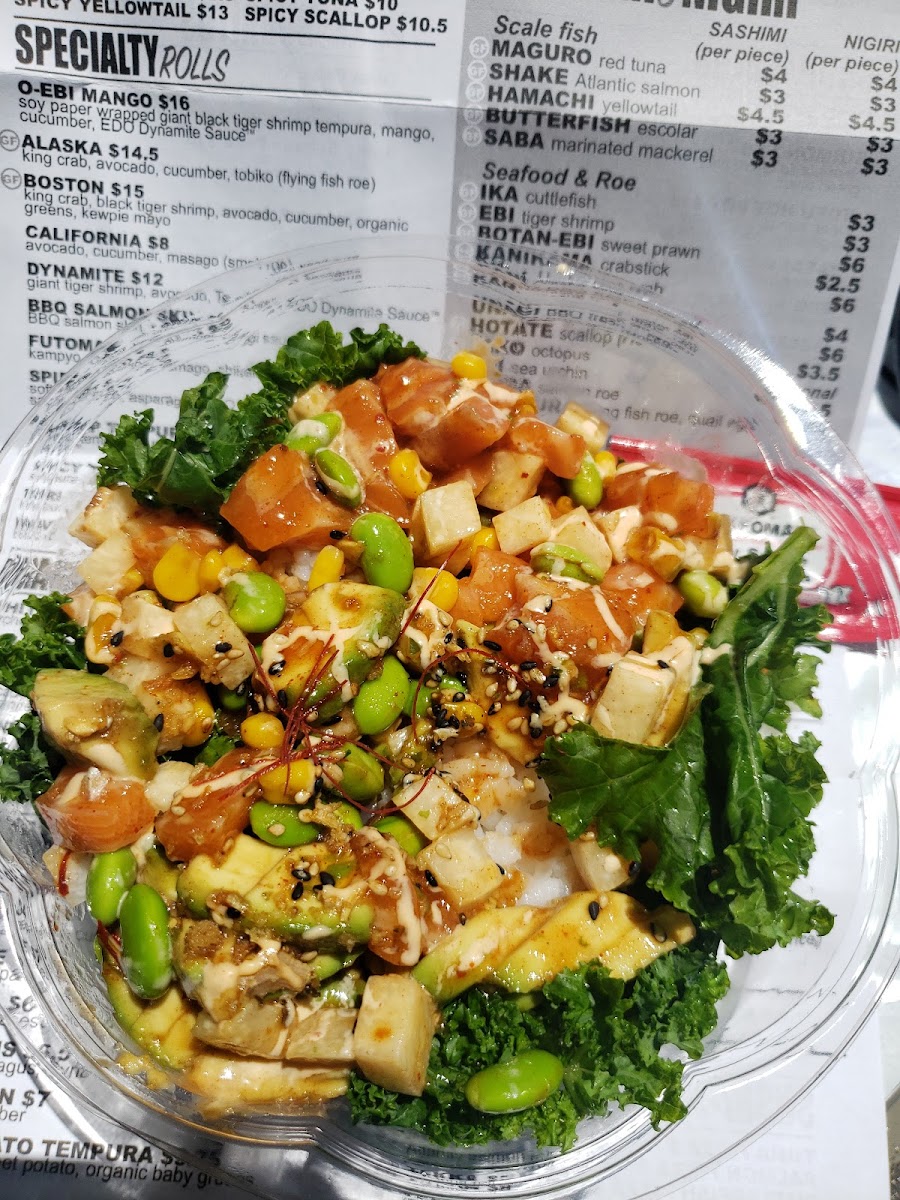 Soy-marinated tuna, dynamite sauce, red cabbage, carrots, hiyashi wakame, edamame, corn, sesame seeds & kale with sushi rice.