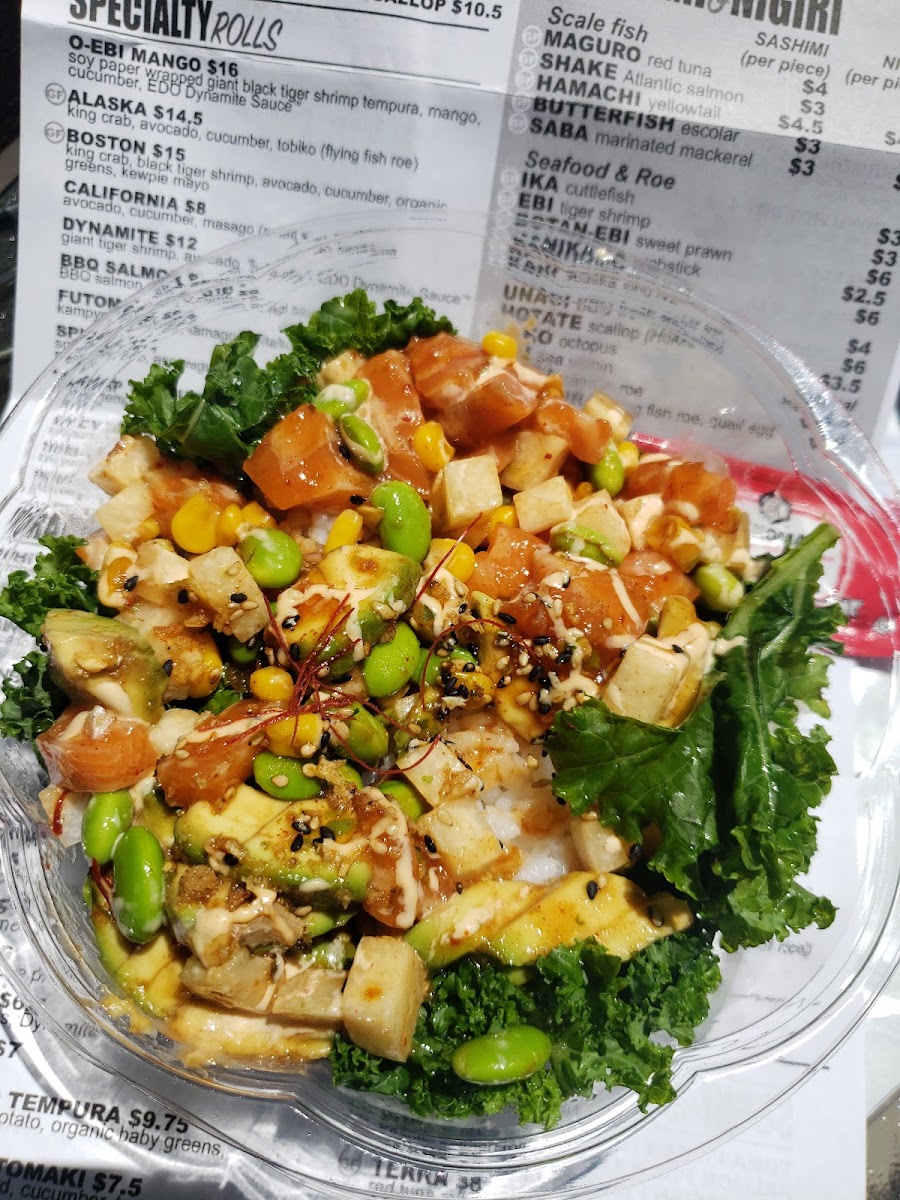 Soy-marinated tuna, jicama, avocado, edamame, corn, garlic chips & kale with ponzu sauce served on your choice of base.